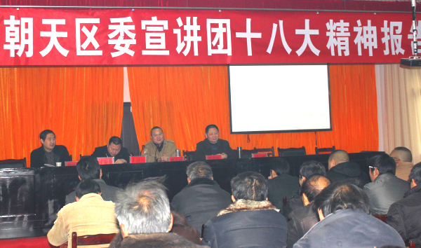 宣讲团深入解析了十八大的鲜明主题和历史意义,回顾了党和国家在党的十六大以来经济社会发展的重大成就,重点阐述了科学发展观的历史地位和中国特色社会主义这条主线的丰富内涵,系统讲解了全面建成小康社会和全面深化改革开放的总体目标以及社会主义经济、政治、文化、社会、生态文明“五位一体”建设的重大部署和重大举措,详细介绍了提高党的建设科学化水平的任务和要求。深入解读了朝天委学习贯彻十八大,牢牢把握“加快振兴发展、推进全面小康”主题,大力实施“四化联动、文化推动、民生带动、创新驱动”战略,着力构建“三中心三基地”,建设生态文明繁荣和谐新朝天的重要举措和奋斗目标。同时,结合大滩片区实际情况,对当地经济社会发展提出了指导性意见。