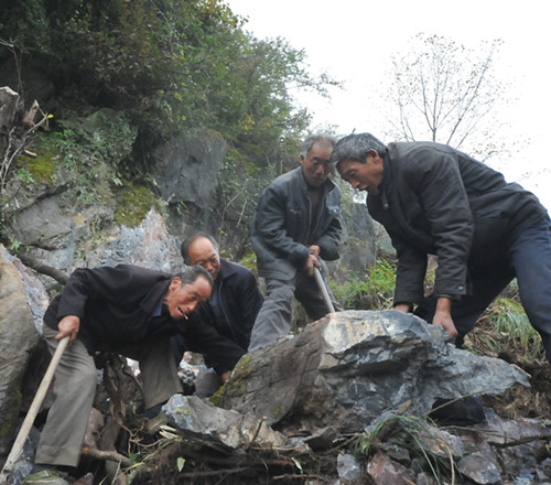 按照邱子文的规划,这条村道的修建分三步走,一是砍出毛路,二是铺设路基,三是实施硬化。经过近300多天的艰苦奋战,17公里主道毛路已经顺利完工。此时的邱子文仍旧带领大家继续战斗在工地上,他想一鼓作气,在2012年春节前实现组与组之间的毛路公贯通。