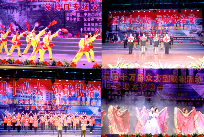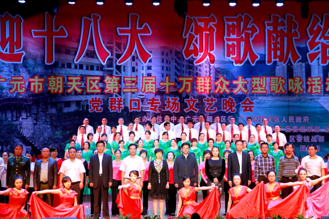 (刘保刚)曲曲红歌映丹心,缕缕心声表深情。9月28日晚,朝天影剧院灯光璀璨,歌声如潮,朝天区党群口“喜迎十八大,颂歌献给党” 大型歌咏专场晚会隆重举行。蔡邦银、伏玉琼、梁黎、贾光升、卢达昌等在家的区四大班子领导与广大干部群众一起欢聚一堂,用深情的歌声向党表达无限感恩之情。至此,朝天区第三届十万群众大型歌咏活动画上圆满句号。区委常委、宣传部长张大鸿致辞。