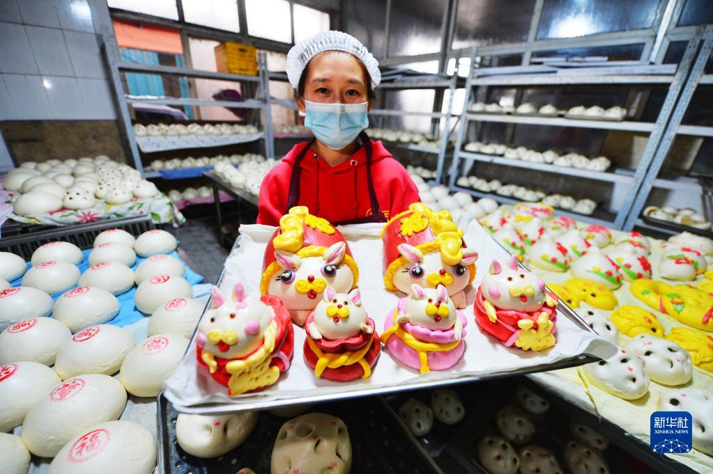 山东省青岛市城阳区红岛街道观涛社区的居民在制作传统花馍,花样别致的花馍寓意美好生活“蒸蒸日上”(1月17日摄)。新华社发(王海滨 摄)