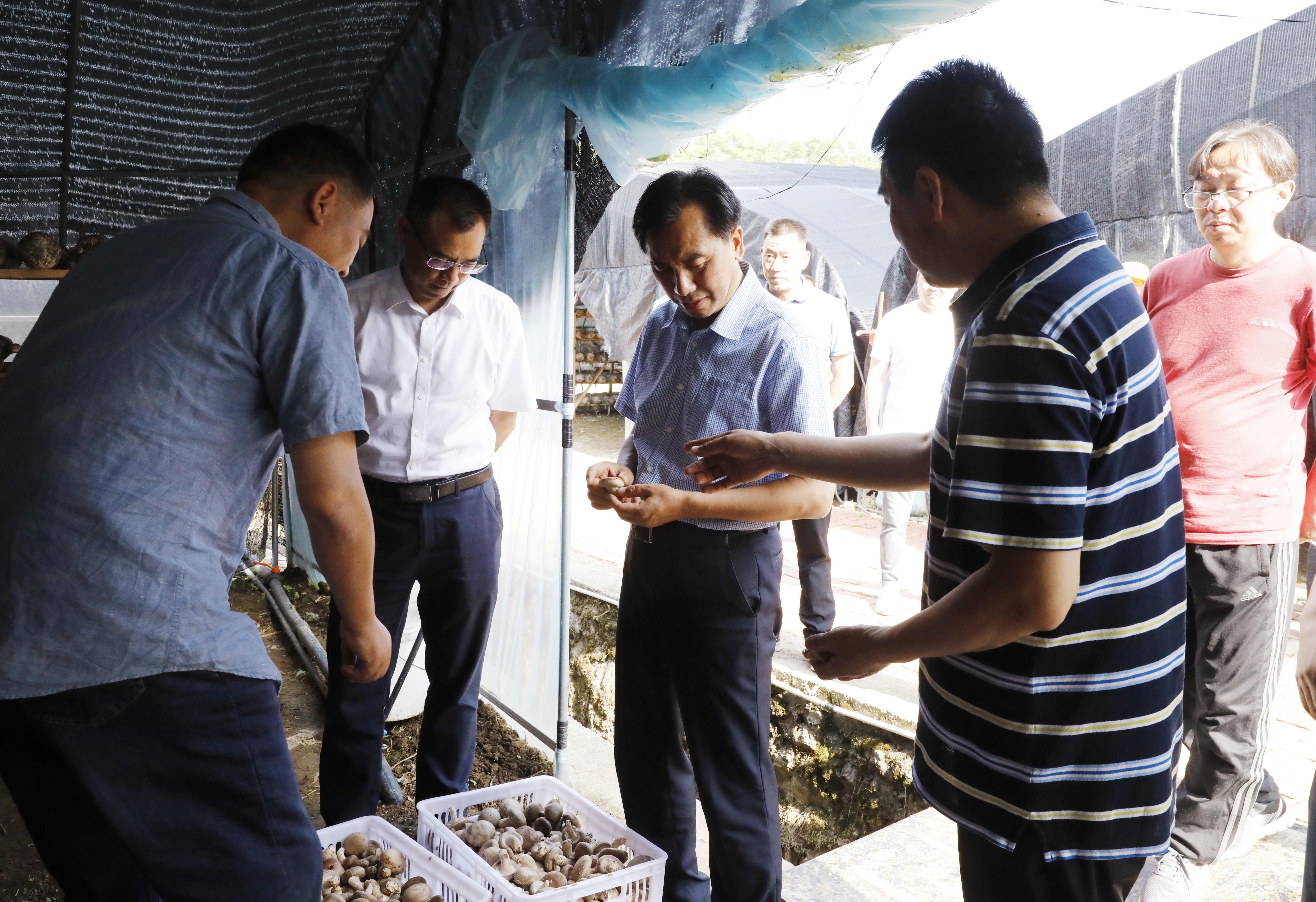 “共有多少大棚?产量怎么样?主要销往哪里?”在李家镇卫星村调研夏菇实验基地,张骏参观了夏菇种植大棚,详细询问了夏菇的种植技术、产量和销售渠道等情况。他鼓励基地要继续加强技术创新和品种改良,通过引进先进技术和培育新品种,进一步提高夏菇的产量和品质。要加强市场调研,积极拓展市场,将优质的夏菇产品销往各地,满足更多消费者的需求。要提供务工机会,带动周边更多群众就近就业,不断增加农民收入。