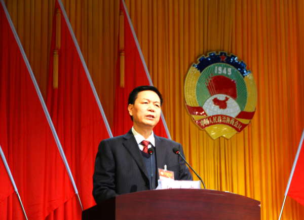 区政协主席贾光升代表政协第五届广元市朝天区委员会常务委员会向大会作工作报告