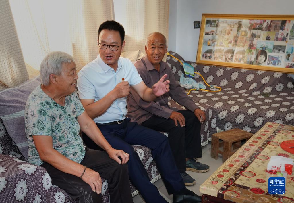 在河南省辉县市张村乡裴寨村,裴春亮(中)到村民家里走访(9月8日摄)。新华社记者 李安 摄