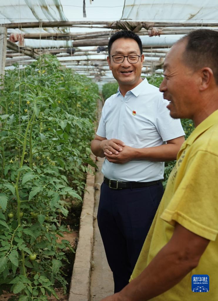 在河南省辉县市张村乡裴寨村,裴春亮(左)在村民的蔬菜大棚里了解种植情况(9月8日摄)。新华社记者 李安 摄