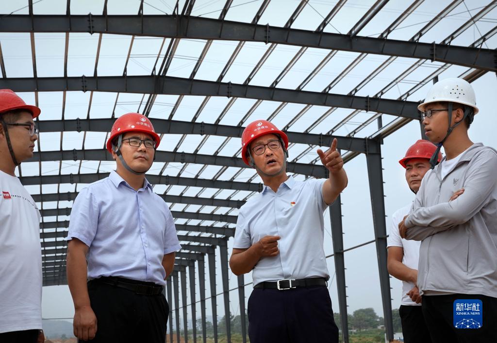 在河南省辉县市张村乡裴寨村,裴春亮(中)在了解产业园的建设情况(9月8日摄)。新华社记者 李安 摄
