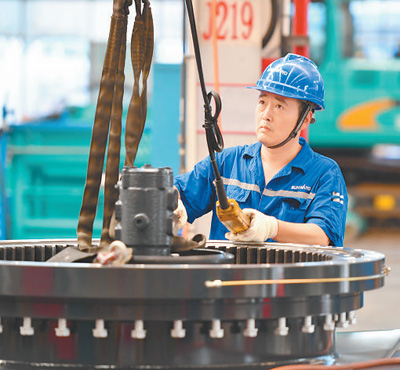 中部地区加快崛起,先进制造业迅速发展,产业升级迈出实质性步伐。图为2022年7月,湖南省长沙市山河智能装备股份有限公司工人在组装挖掘机。
