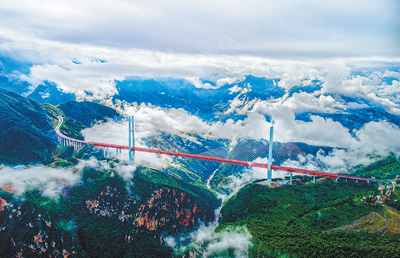 国家高速公路网主线基本建成,高速公路通车里程16.91万公里,2021年比2012年增长76%。图为世界第一高桥贵州北盘江大桥。