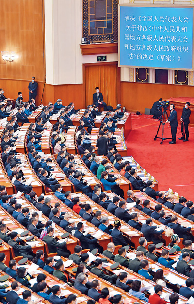 与时俱进完善人民代表大会制度。健全人大组织制度和工作制度,修改全国人大组织法、全国人大议事规则、地方组织法、全国人大常委会议事规则。图为2022年3月11日,地方组织法修正草案表决现场。