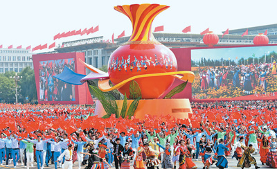 不断铸牢中华民族共同体意识。党的十八大以来,习近平总书记作出“铸牢中华民族共同体意识”这一重大论断,成为新时代党的民族工作的鲜明主线。图为2019年10月1日,庆祝中华人民共和国成立70周年群众游行“民族团结”方阵。