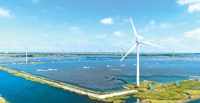 2021年,全国可再生能源装机规模突破10亿千瓦,风电、光伏发电装机均突破3亿千瓦,水电、风电、光伏发电、生物质发电装机均居世界第一;新能源发电量突破1万亿千瓦时。图为江苏省东台市“风光渔”互补产业基地。