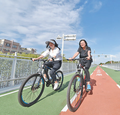 绿色生活创建行动全面推进,节约型机关、绿色家庭、绿色学校、绿色社区、绿色出行、绿色商场、绿色建筑等创建行动深入开展,重点领域消费绿色转型成效显著。图为北京市民在自行车专用路上骑行。