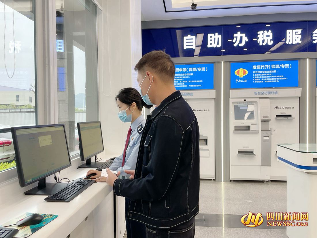 扫场所码,进入高竹新区管委会,院子里停着许多川X和渝B的车辆,在一楼的高竹新区税费征管服务中心,有几名办税人员正在自助办理税费。“请在这里把你身份证上的信息填上去。”“请问你打算用哪种缴费方式进行缴费?”自助办税服务区内,工作人员耐心地指导办税人员,一名大叔办税完毕,收拾资料准备离去。