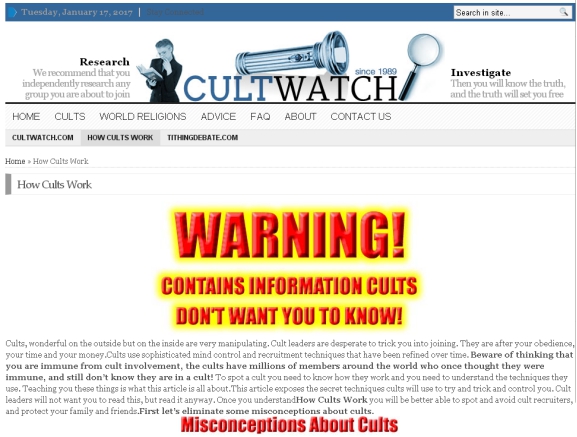 核心提示:Cultwatch成立于1989年,是一个由不同基督教派别组成、不由任何一个教派拥有和控制的组织,旨在向人们提示邪教的危险,避免人们误陷邪教。Cultwatch刊登了一篇题为《邪教组织如何工作——那些邪教不想让你知道的事!》的文章,将邪教的种类、精神控制的伎俩、招募手段等进行揭露,并给读者提供了一些显而易见的辨识手段。