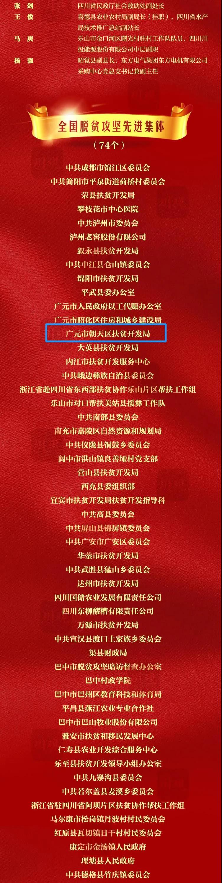 2月25日,全国脱贫攻坚总结表彰大会在京隆重举行。10名个人、10个集体获全国脱贫攻坚楷模荣誉称号,大会还对1982名全国脱贫攻坚先进个人,以及1501个全国脱贫攻坚先进集体进行表彰。四川共有98名个人、74个集体上榜。其中,朝天区扶贫开发局荣获“全国脱贫攻坚先进集体”称号。