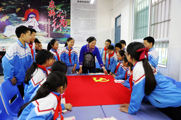 国家非物质文化遗产麻柳刺绣传承人张菊花教学生绣党旗
