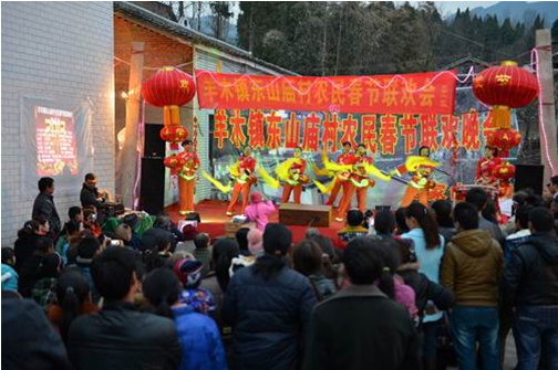 在悠扬的乐曲声中,两名农民节目主持人宣布晚会开始。一开场,8位身着舞蹈演出服的农家大婶为大伙打起了腰鼓,响亮的鼓点,热烈的节奏,一出场就博得了乡亲们热烈的掌声。“生活富裕奔小康,传统美德不能忘,赡养老人是义务,幸福花开万年长……”由53岁村民王心全自编自演歌颂党的好政策的快板《扯白歌》让大家打起节奏,三个十二、三岁的孩子表演的相声《云南十八怪》,台词风趣幽默,看台下的大爷大妈们听了,脸上褶子都堆成了花。歌曲《无所谓》,农家小伙嗓音纯净洪亮,不时挥手致谢,颇有明星大腕的风范……