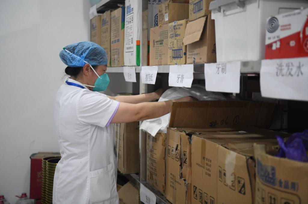 “这个袋子里面是我们打包装好的隔离人员生活物资,里面备齐了毛巾、牙刷牙膏、拖鞋等生活用品。”在隔离点的物资库房内,后勤保障部工作人员贾桂蓉正细心清点着生活物资并打包。“先将这些生活用品清点装好,隔离人员入住后,为他们发放《隔离医学观察告知书》,再将打包好的物资送到门口台阶处,由专门的消杀人员送到他们手中。”贾桂蓉介绍,物资储备库分区域储备了可供150人使用一个月的医疗物资和生活物资,后续根据使用情况随时补充。