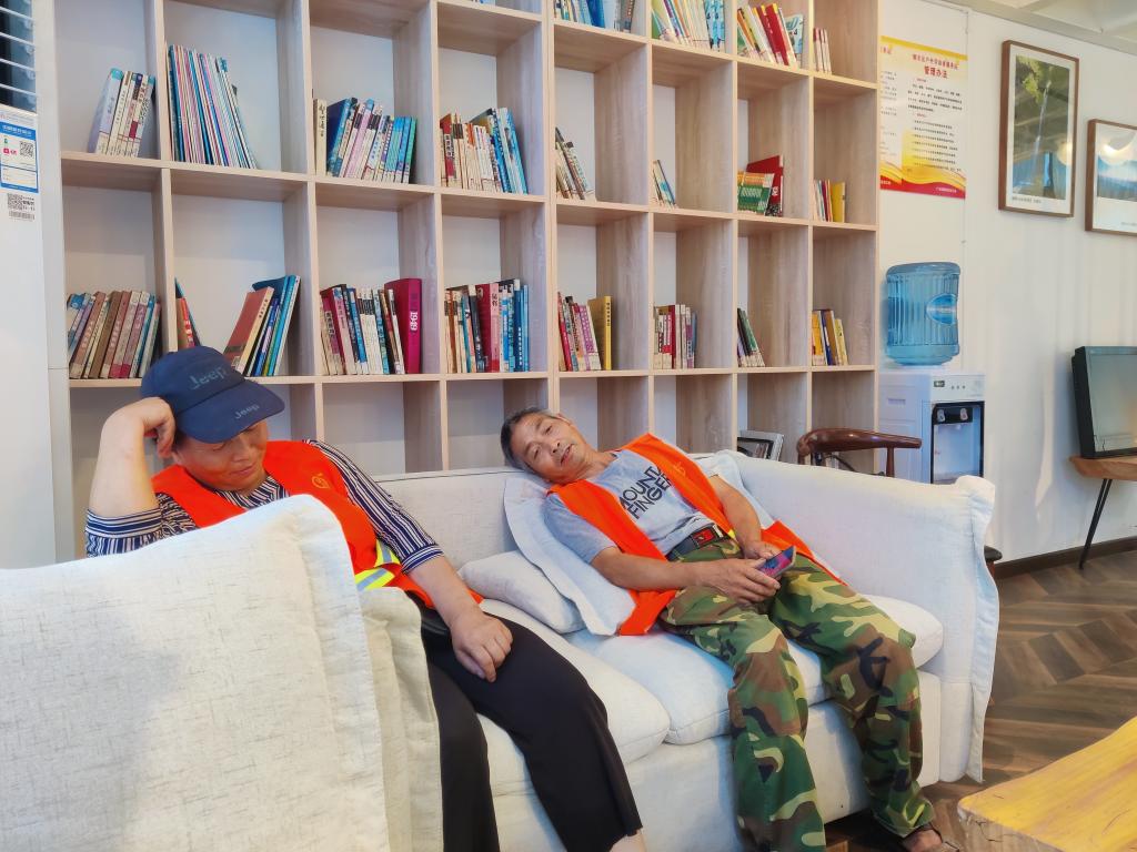 6月24日,夏至后的朝天,天气已经正式开始炎热起来。环卫工人哈志芬做完滨江路的保洁工作后,走进朝天区总工会在时代广场设立的户外劳动者服务站点,倒上一杯水,坐在沙发上开始小憩,空调的冷气很快吹走了身上的高温。