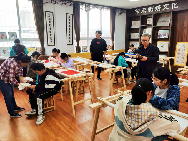 一进学校大门,以“一牌、一屏、一塑、一环”为代表的刺绣文化单元跃然眼前;教室里,孩子们用针线绣出别具风格的班风班训;刺绣传习室和刺绣文化研究室里,一幅幅生动优美的作品整齐排列……