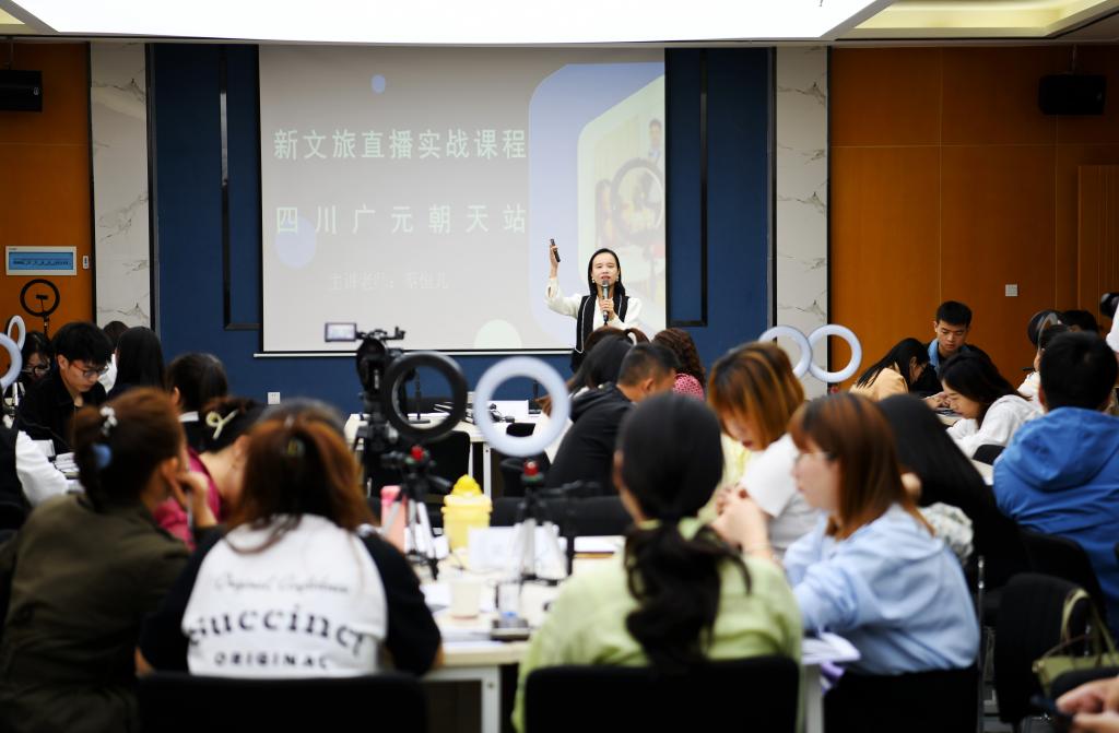 5月5日上午9点30分,广元市朝天区联合国机集团举办的乡村振兴“双百”网络达人暨直播电商人才培训班准时开课。记者看到,朝天区电商公共服务中心的二楼培训室里座无虚席,大家正聚精会神地听老师讲解《文旅景区直播实战运营攻略》课程。