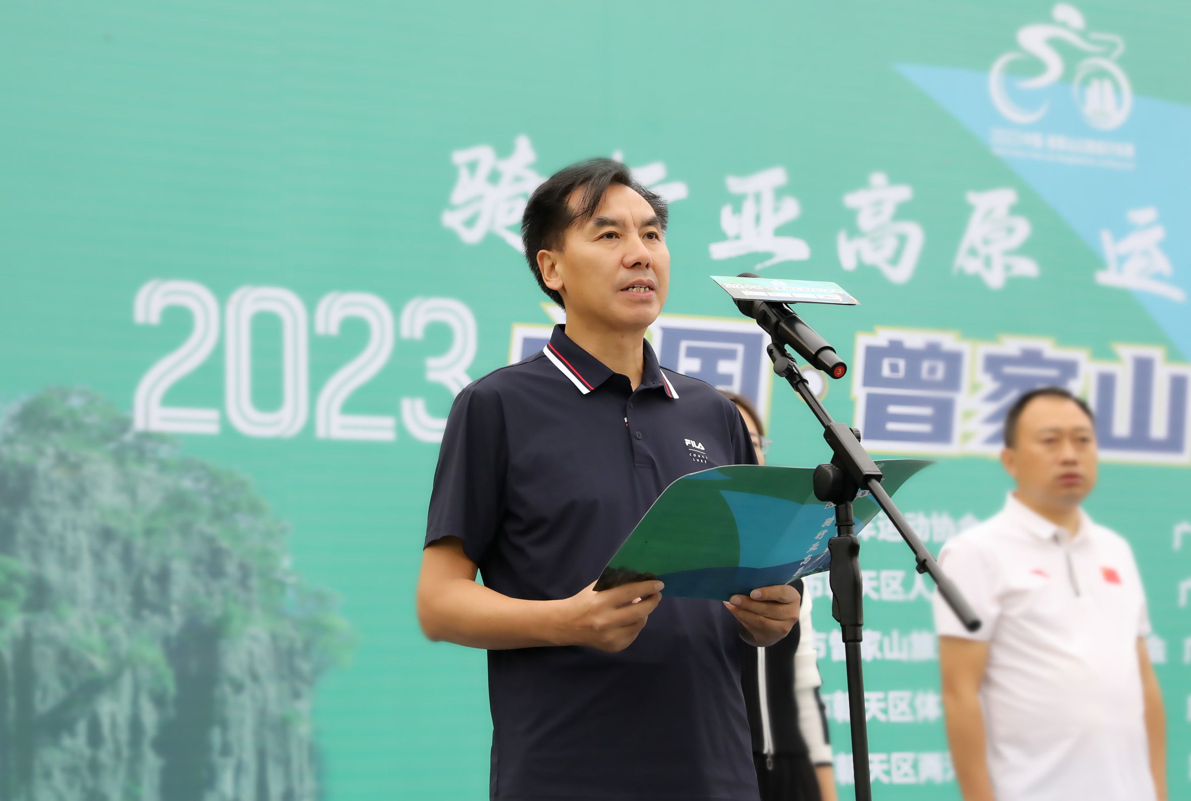 余飞宇在致辞中向出席活动的各位领导、各位嘉宾、全体参赛选手表示热烈的欢迎。他说,近年来,朝天区坚持“绿水青山就是金山银山”的发展理念,依托曾家山良好的生态资源优势,主动把体育融入大生态、大健康格局,努力“唱好山字经,打好体育牌”,强力推进“体育+”持续健康发展,建成了一大批体旅融合精品项目,成功举办了一系列大型赛事活动。当前,正加快创建曾家山国家级旅游度假区、国家体育旅游示范基地,此次2023中国·曾家山公路自行车赛必将为曾家山增强软实力、丰富文旅产品、推动“体育+”融合发展、加快全域旅游建设发挥重要推动作用,也将为朝天区文体旅游产业实现大发展大繁荣,推动朝天提升知名度、影响力发挥巨大的桥梁和纽带作用。他希望各位参赛选手充分演绎“更高、更快、更强”的体育精神,赛出风格、赛出水平、赛出友谊;广大裁判员秉公执法,客观评判,确保赛事公正公平。