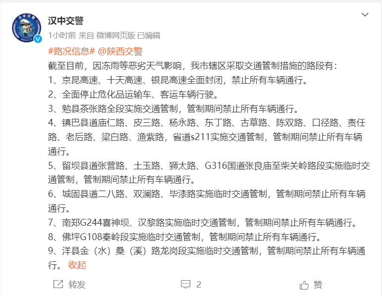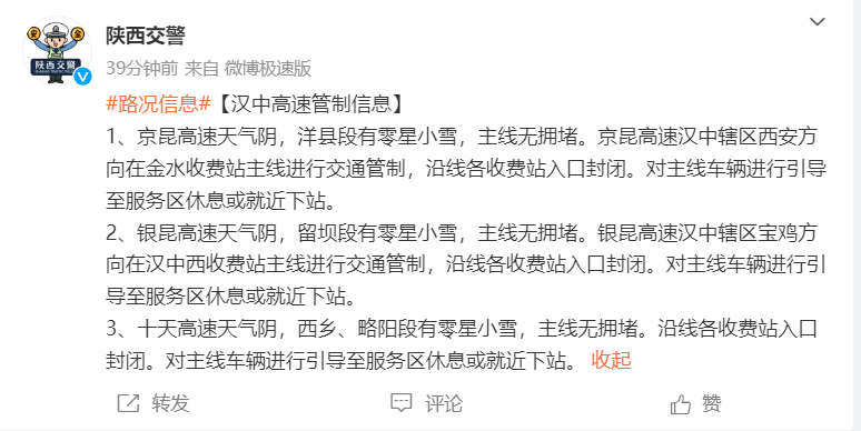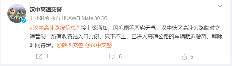 2024年02月21日,陕西省境内普降雨雪并出现冻雨天气,道路湿滑结冰,陕西全境高速公路已经实行只出不进临时交通管控措施。