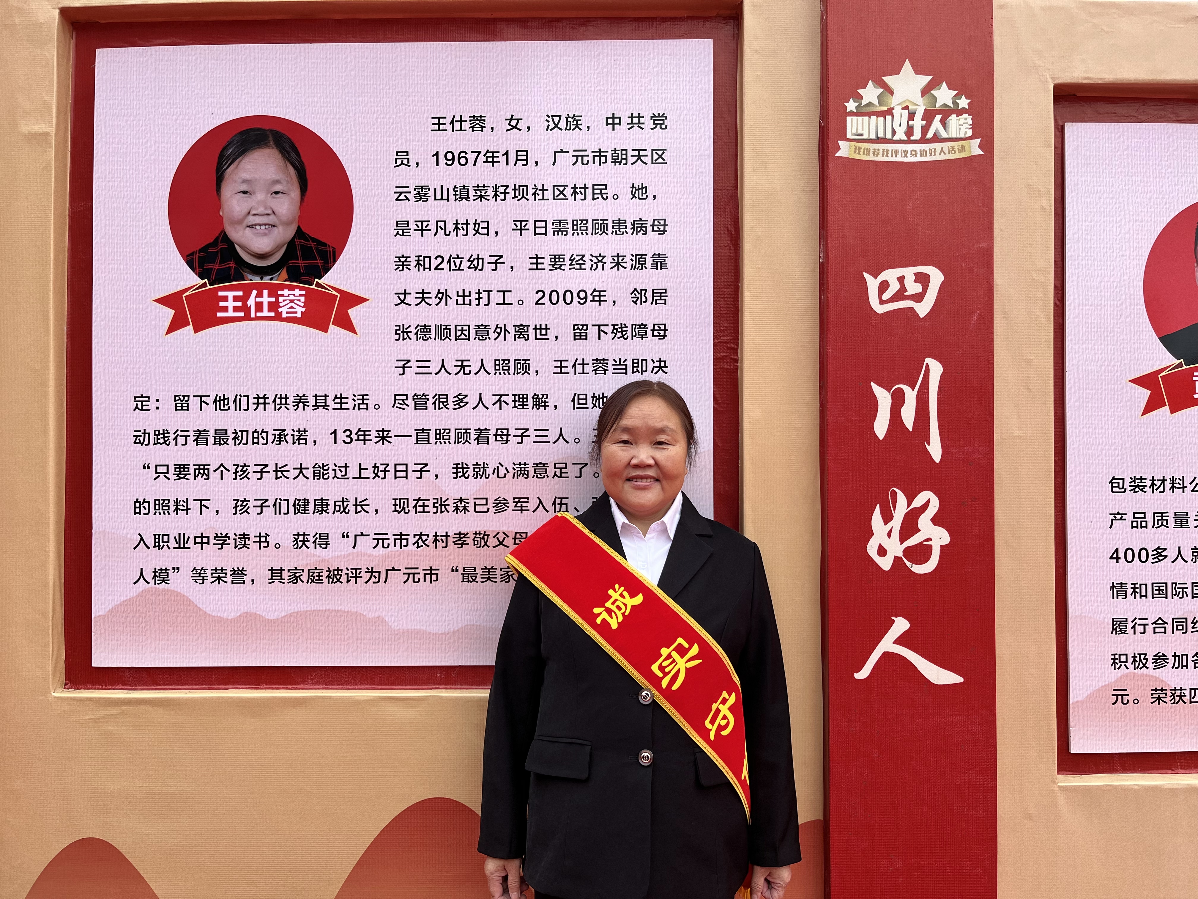 2022年9月,朝天区云雾山镇菜籽坝社区群众王仕蓉上榜第三季度“四川好人”;2024年1月,王仕蓉又被评为第二届广元市孝老爱亲道德模范。15年以来,王仕蓉收留照顾邻居残障母子三人,“柔肩一副挑两家,老幼不弃冬又夏”,“抚孤义母”的事迹感人至深。