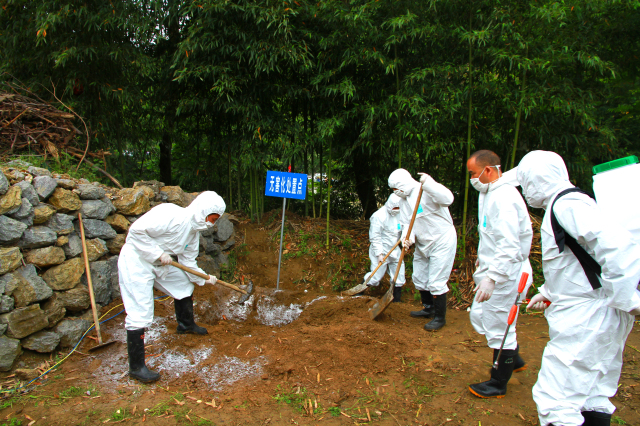 区畜牧食品局组织的应急处置人员将河中死鱼【官网】打捞上岸后,及时进行无害化处置