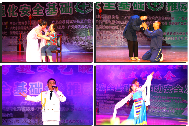 舞蹈《我的祖国》拉开了整场晚会的序幕。说学逗唱《说安全》紧扣今年“安全生产月”活动主题“强化安全基础、推动安全发展”;独唱《烛光里的妈妈》讴歌了安全生产监督管理工作者们忘我的工作热情;小品《宁停三分不抢一秒》,通过演员夸张的表现手法,刻画出交通肇事者对因不遵守交通法规对他人及自己家庭造成伤害的无比悔恨……晚会还通过安全知识抢答的形式向群众宣讲安全生产知识相关内容,观众们踊跃地回答主持人提出的问题,并不时为自己的同伴竞答呐喊助威,把整个晚会推向高潮。晚会在《四季平安》的合唱声中圆满结束。