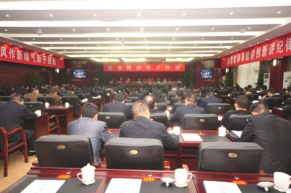 区委书记蔡邦银在会上作了重要讲话。他说,在区“两会”胜利闭幕之后,紧接着召开区委区政府工作会,旨在进一步落实区委六届三次全会的总体部署,动员组织全区广大干部群众,围绕新目标,认清新形势,抢抓新机遇,乘势而上,攻坚克难,坚决打赢振兴发展和全面小康关键战。蔡邦银从人生观和价值观、工作作风、工作方法、廉洁自律四个方面,给全区广大党员干部上了一堂生动的党课。