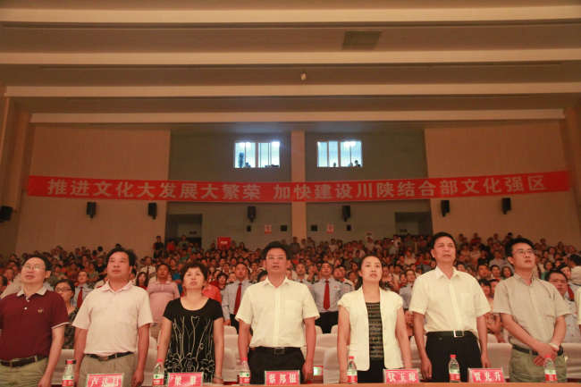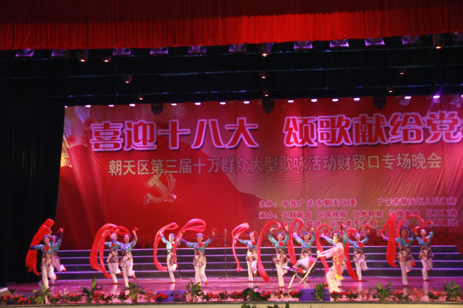 8月1日晚,区影剧院迎来“喜迎十八大、颂歌献给党”朝天区第三届十万群众大型歌咏活动——财贸口专场演出。来自财贸系统的干部职工激情满怀,以嘹亮的歌声、优美的舞蹈,歌颂共产党,喜迎十八大。区委书记蔡邦银,区委副书记、区长伏玉琼,区人大常委会主任梁黎,区政协主席贾光升等四大班子领导观看了本次演出。