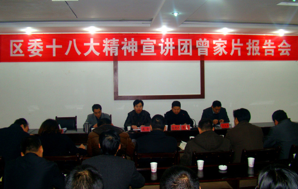 (区委组织部)12月14日,区委常委、组织部长、区十八大精神宣讲团第四宣讲团团长赵铮带领第四宣讲团成员赴曾家片开展十八大精神宣讲。曾家片六个乡镇党政领导班子成员及曾家镇全体机关干部聆听了宣讲报告会。