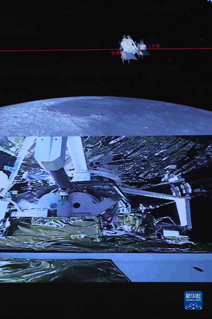 这是在北京航天飞行控制中心指挥大厅拍摄的嫦娥五号上升器与轨道器返回器组合体交会对接画面(2020年12月6日摄)。新华社记者 金立旺 摄