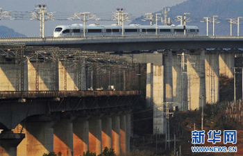 图为2014年12月,一辆高铁试验列车行驶在横跨浙赣铁路桥的沪昆高铁浙江义乌东特大桥上。(新华社记者谭进 摄)