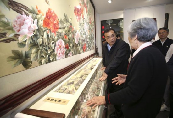 李克强2017年5月8日晚来到开封七盛角民俗文化街,在王素花汴绣馆长时间驻足。82岁的王素花多年继承创新宋代传统刺绣工艺,是汴绣领军人物。总理仔细观赏后称赞她用色“多而不杂”,技艺“炉火纯青”。