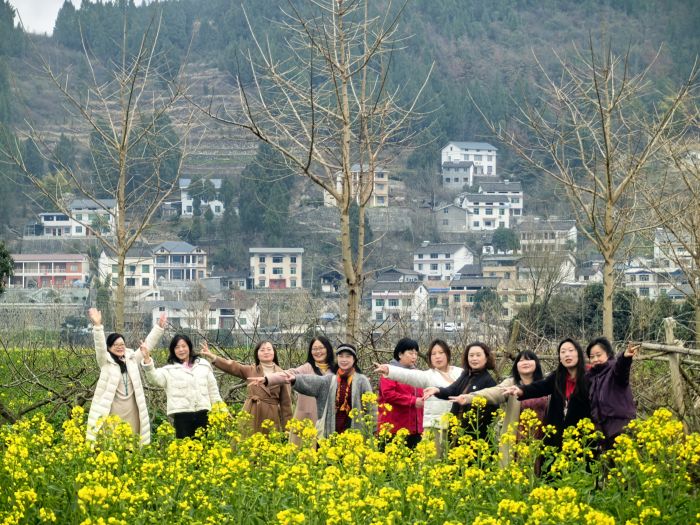 蓝天白云下,盛放的油菜花、樱桃花随风摇曳,金黄、洁白的花海与四周的青山、古朴村舍相互交融,勾勒出一幅幅如诗如画的田园风光画卷……作家们漫步赏花、拍照打卡,畅享田园风光。