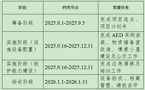 2025年12月底前完成一台AED配置,组织项目点相关人员参加AED正确使用培训,确保相关人员熟练掌握操作技能,为心脏骤停患者的及时抢救提供有力支持。