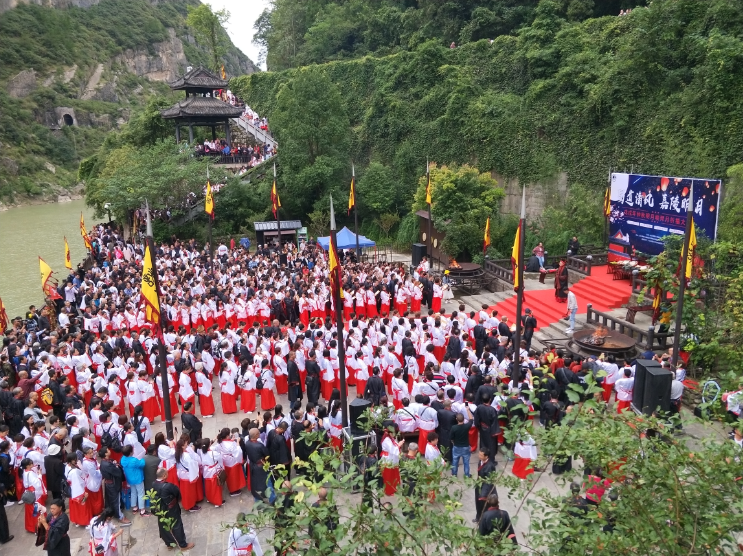 期间,在明月峡景区演武场还隆重举行了一场以“蜀道清风、嘉陵明月”为主题的“明月峡拜月祈福大典”活动,“正衣冠、千人汉服行汉礼、祈福典,千人齐诵蜀道难”,祈福典活动规模宏大、意义深远,吸引着无数游客驻足参加。