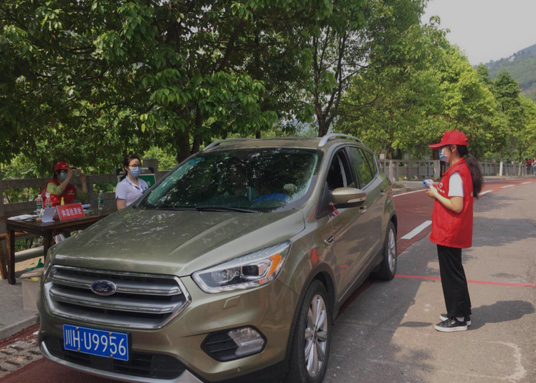 明月峡景区停车场入口处,游客正配合工作人员测量体温有序入园。