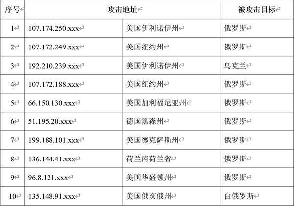 经分析,这些攻击地址主要来自美国,仅来自纽约州的攻击地址就有10余个,攻击流量峰值达36Gbps,87%的攻击目标是俄罗斯,也有少量攻击地址来自德国、荷兰等国家。