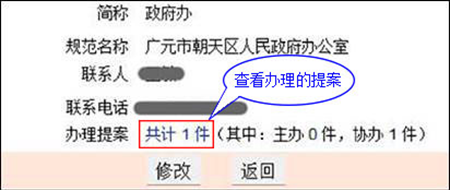 政协委员可以查看自己个人信息资料,包括五个一活动、出席会议的情况。部门(党派团体)可以查看本部门简称、规范名称、通讯地址、联系人及联系电话、部门权限,该页面同时显示由本部门办理(党派团体提交提案)的提案件数,并且可以进入查看具体目录(如图2)。