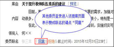 被通知联名的委员登录系统进入首页,点提案图标进入提案目录页面,选择提案首页我的提案(参照图3),找到请求自己联名的提案,点击提案案由(标题)进入内容页面。如果表示赞同则点同意,不赞同则点拒绝,同意后也可以在规定时限内撤销联名(如图6)。