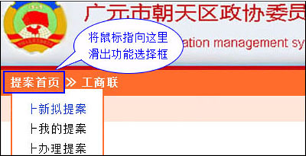 进入系统首页,点击提案图标,进入个人提案目录页面,将鼠标指向页面左上角提案首页字样,页面向下滑出选择框,移动鼠标到选择框,点击新拟提案即可进行提交(如图3)。
