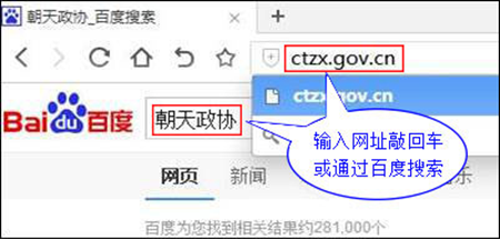 打开你的浏览器在地址栏输入网址:ctzx.gov.cn,敲击回车;或者使用百度搜索朝天政协字样,也可以找到网址(如图1)。
