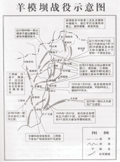 羊木坝战斗,民国政府是这样写入史志的:“匪乘上游(指嘉陵江)无兵,分二万余人偷渡大滩、横梁、沙溪、朝天,漫山穿谷,自陈家坝至羊木坝东山庙,星罗棋布,斜瞰乌龙。连日又在沙河,须家河假榻作桴,络绎偷渡,据邱坝蓝坝,准备攻山”。 ⑥