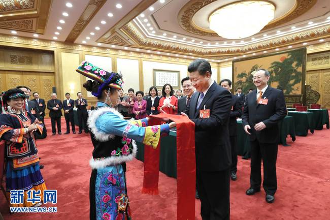 3月8日,中共中央总书记、国家主席、中央军委主席习近平参加十二届全国人大五次会议四川代表团的审议。习近平走进会场时,身着民族服装的藏族、彝族、羌族代表向总书记问好。这是藏族代表献上洁白的哈达。新华社记者兰红光摄