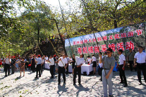 开幕式结束后,与会嘉宾齐聚沙河镇岳家村,开展有机核桃采摘体验系列活动。